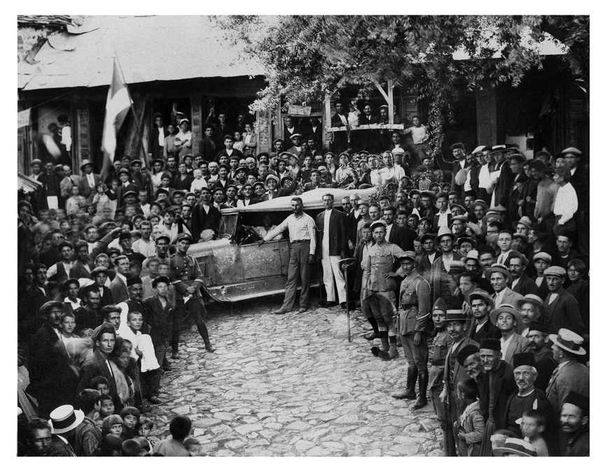 Κάτοικοι της Σαμαρίνας κατά την υποδοχή του πρώτου αυτοκινήτου στην πλατεία της κοινότητας, 1932